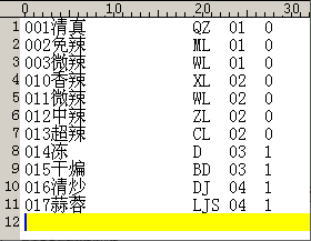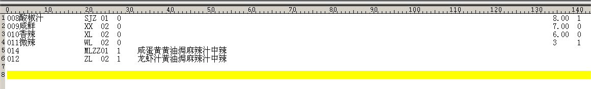 编号(5位)、类别号(2位)、中文名称(20位)、单价(9位)、单位(4位)、重量单位(4位)、菜品属性 (1位)、作法(45 位)、助记码(10位)、做法加价(60位)、空格(12位)会员价(9位)